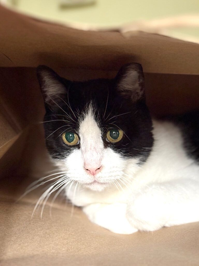 Getting your pet to sit still and look at the camera can be tricky. Use their favorite treats or toys to keep their attention. You can also make a soft noise, like a whistle or a squeak, to get them to tilt their head for an irresistibly cute expression. Be patient and ready to snap the shot quickly! Our cats love to cuddle together but rarely looked up- It was amazing to see their eyes in this photo!